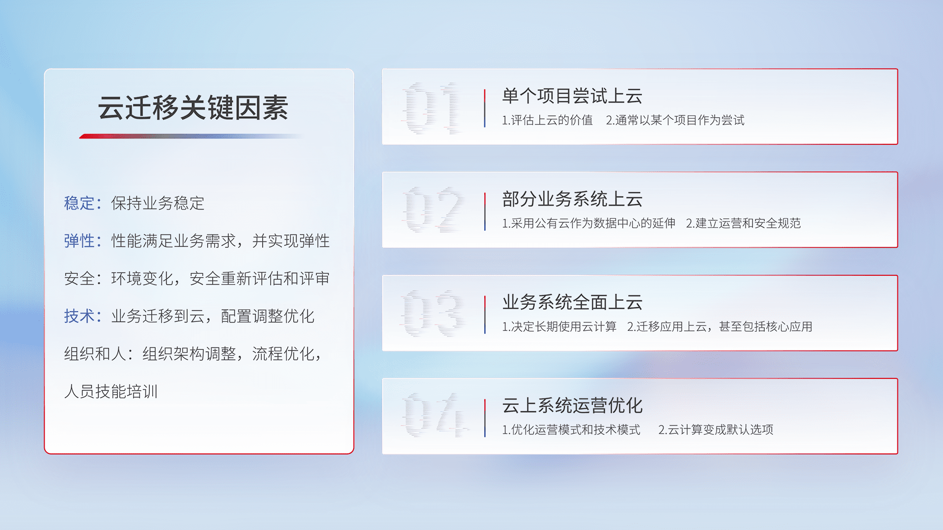 结合实际业务,,,,从规划设计、、、、云平台选型、、、云原生改造、、、、数据迁移、、、集成交付,,,迁移全过程为客户识别最佳上云路径,,做好风险识别管理,,,设计网络架构、、身份权限、、安全审计合规、、、操作审计、、、日志审计、、、、监控告警策略、、、、多站点容灾设计等,,,,对云上基础设施进行整体规划,,提升IT治理水平,,,,以满足弹性、、、、高可用、、、、高性能的需求。。。。