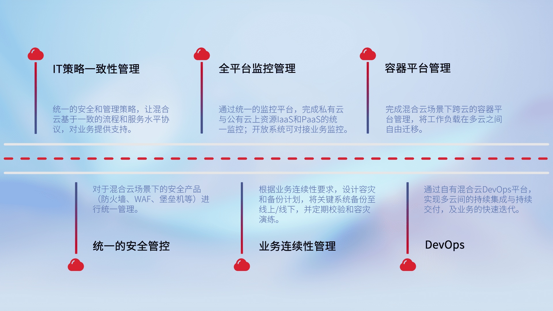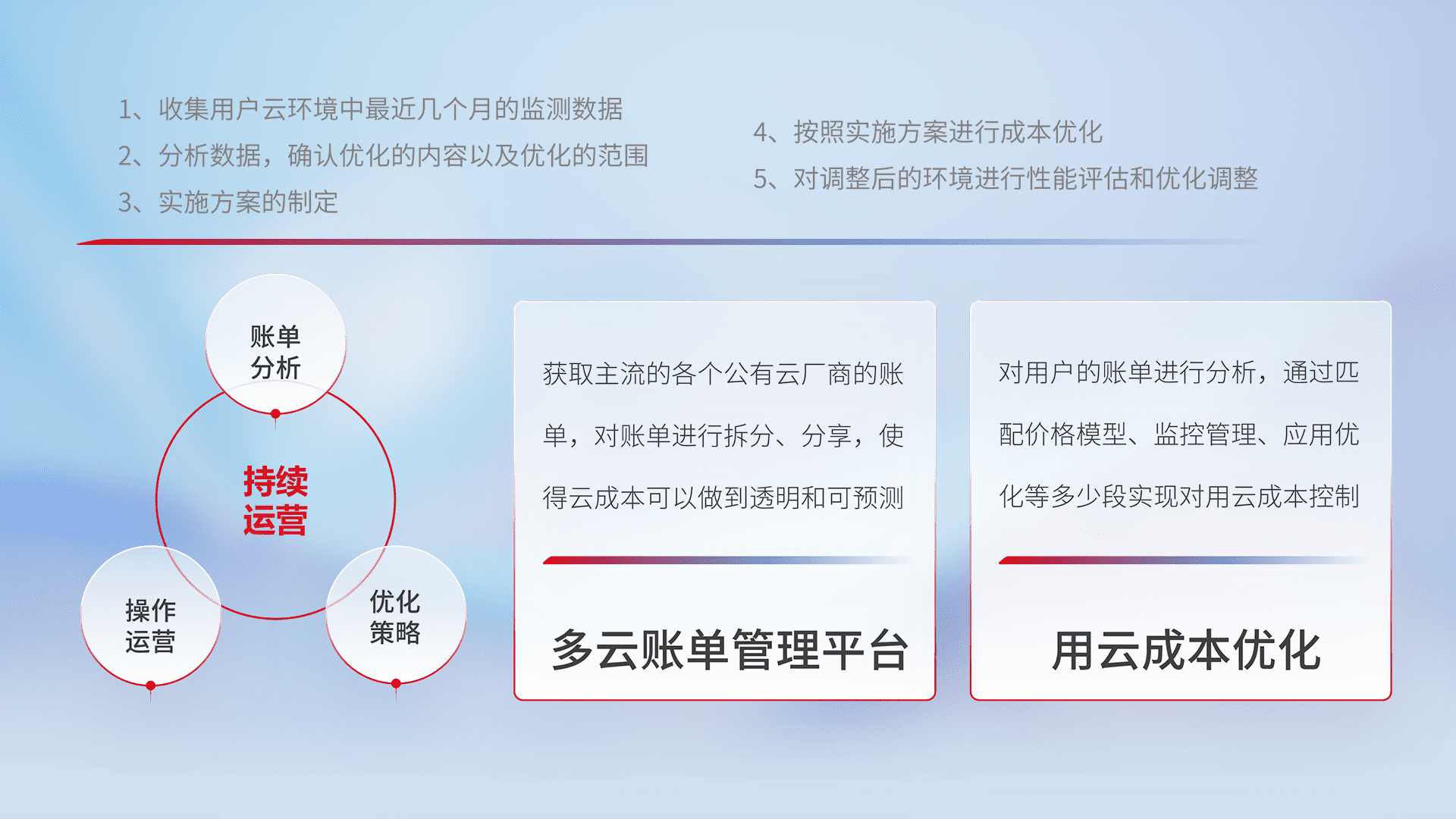 通过多云纳管,,以统一的资源数据模型把客户的云资源进行抽象和封装,,,,进而实现对多云资源的统一操作,,保障云资源管理的可靠性、、稳定性与可用性。。。量身定制化运维内容,,,配置、、、、开发运维、、、补丁管理、、备份、、、、监控、、认证和访问管理、、审计和日常巡检等,,,保障在用云过程中的可靠度,,稳定度以及高可用率。。
