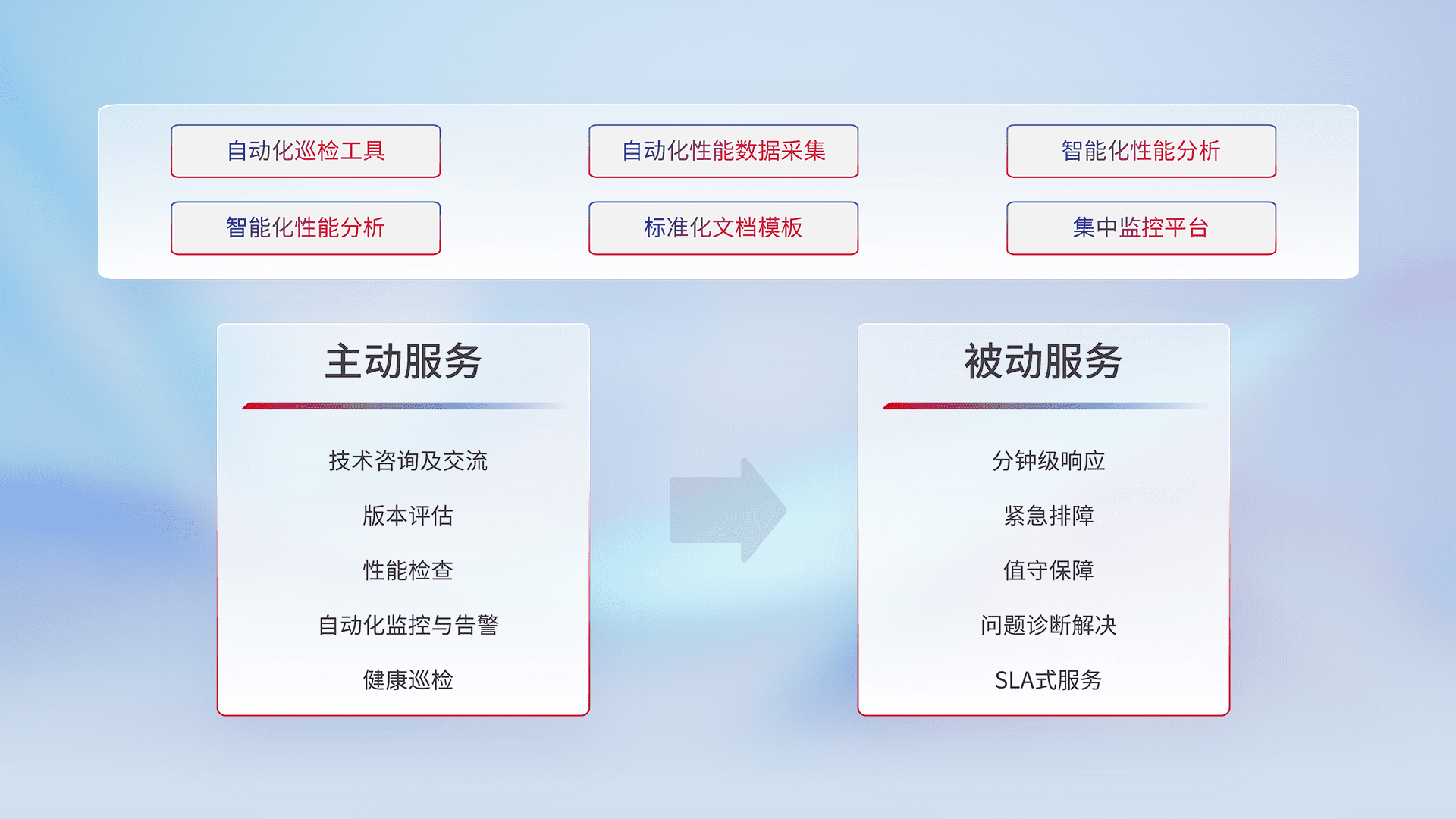 智能化工具和标准化文档,,,,保障服务质量,,,,提供主动服务(包含技术咨询、、、版本评估、、性能检查、、自动化监控与告警、、健康巡检)和被动服务包含(分钟级响应、、、、紧急排障、、值守保障、、、、问题诊断解决、、SLA服务)。。。。