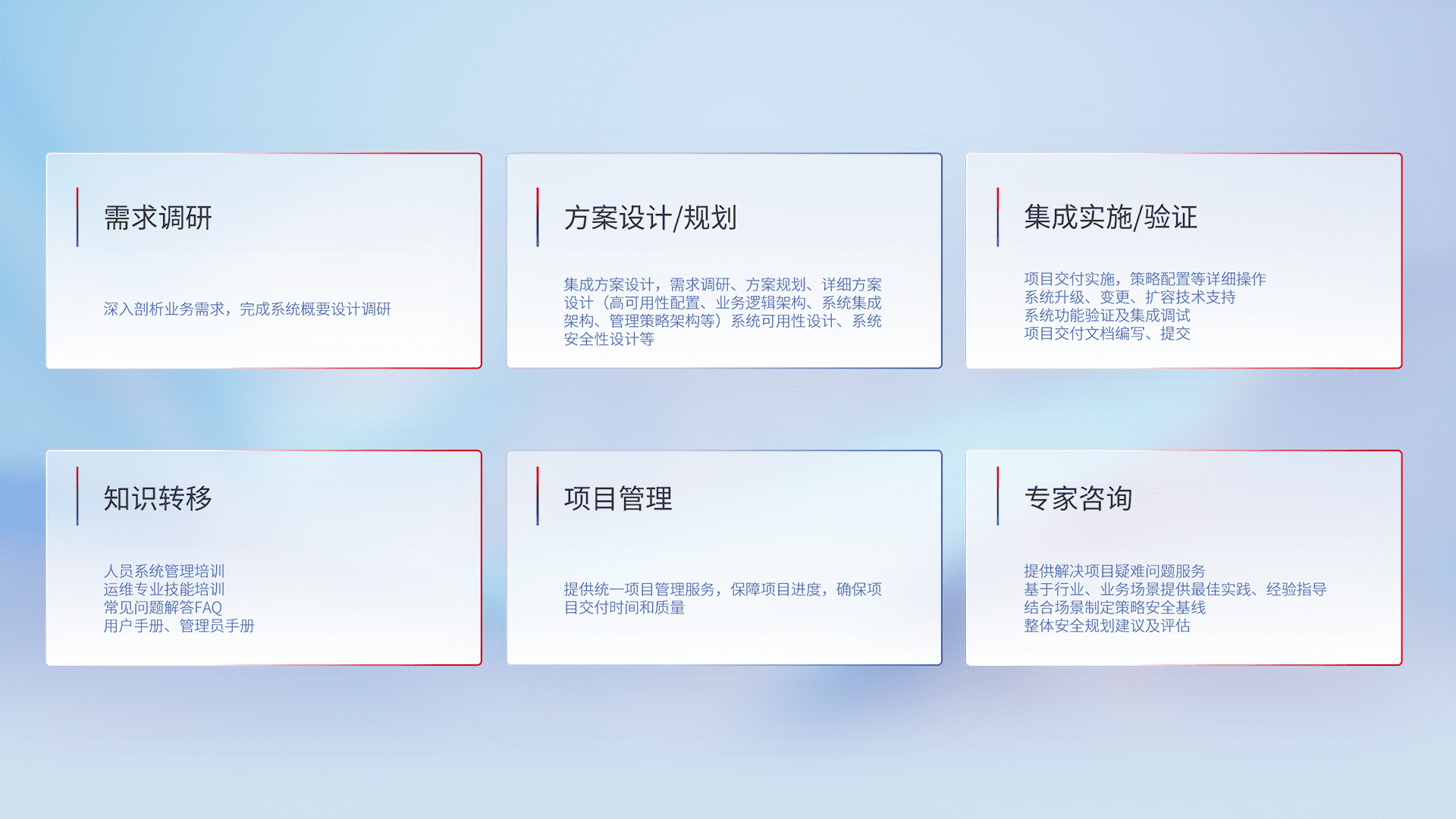 针对客户行业特性,,将宏观的安全战略和需求,,,,通过专业的交付服务,,,,实现项目落地,,为客户提供标准规范的集成交付服务。。
